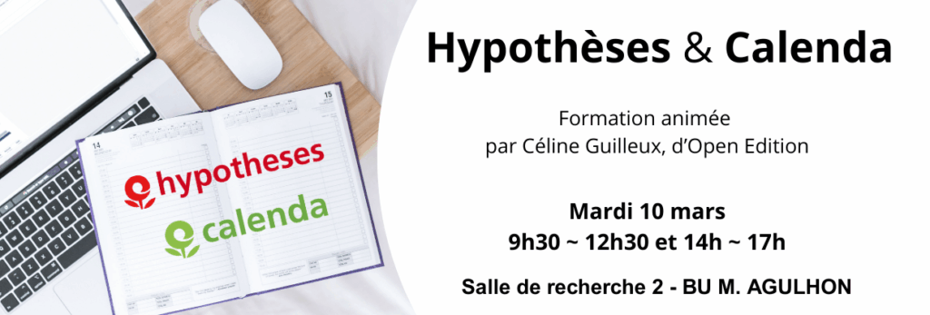 Le service d’appui à la recherche vous propose une formation d’une journée pour vous initier à l’utilisation des outils Hypotheses et Calenda  proposés par la plateforme OPEN EDITION.