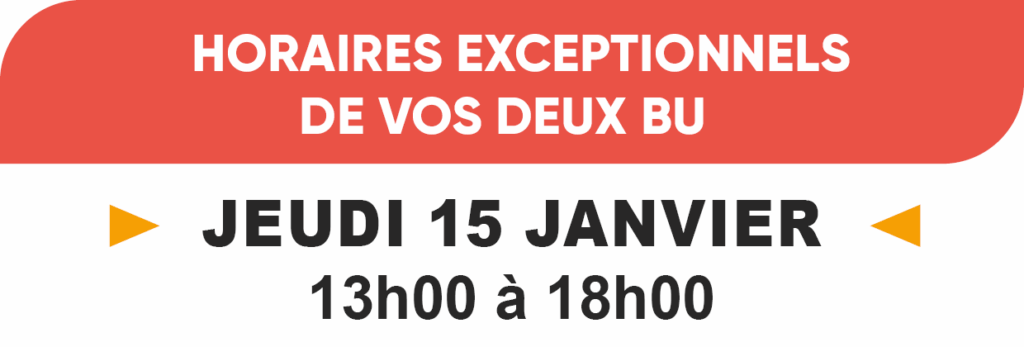 Du 5 au 23 janvier, vos deux BU vous accueillent de 7h45 à 18h.