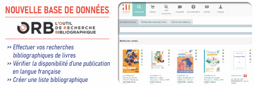 La BU d’Avignon vient d’ajouter une base de données dans la liste des ressources électroniques en ligne accessibles aux usagers. Il s’agit de la plateforme ORB – Outil de Recherche Bibliographique – qui vous permet d’effectuer des recherches bibliographiques de livres, de vérifier la disponibilité d’une publication en langue française dans le commerce, de créer une liste bibliographique, de la communiquer par mail ou de l’imprimer.