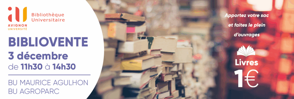 La prochaine bibliovente aura lieu le mercredi 3 décembre, de 11h30 à 14h30 à la BU Maurice Agulhon mais aussi à la BU Agroparc.
