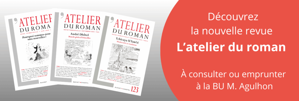 La bibliothèque universitaire vous propose une nouvelle revue, L’atelier du roman, à la BU Maurice Agulhon. Cette revue trimestrielle est exclusivement consacrée au roman. On y trouve des commentaires sur les romans d’aujourd’hui et d’hier, des critiques, des entretiens avec les romancier, des analyses, des rappels sur les grands romanciers et les œuvres qui ont marqué l’histoire du roman. Ont déjà collaboré sept cent cinquante écrivains du monde entier : Milan Kundera, Günter Grass, José Saramago, Ernesto Sabato, Philippe Muray, Michel Déon, François Ricard, Benoît Duteurtre, François Taillandier, Fernando Arrabal, Michel Houellebecq, Yasmina Reza, Kenzaburô Ôé, Emmanuel Carrère, etc.