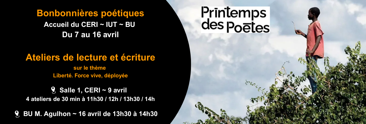 Vous aurez également l’occasion d’explorer votre fibre poétique sur le campus Jean-Henri Fabre grâce à des ateliers «flash » de lecture et d’écriture le jeudi 9 avril en salle 1 au rdc du CERI (4 ateliers de 30 minutes à 11h30 / 12h / 13h30 / 14h).